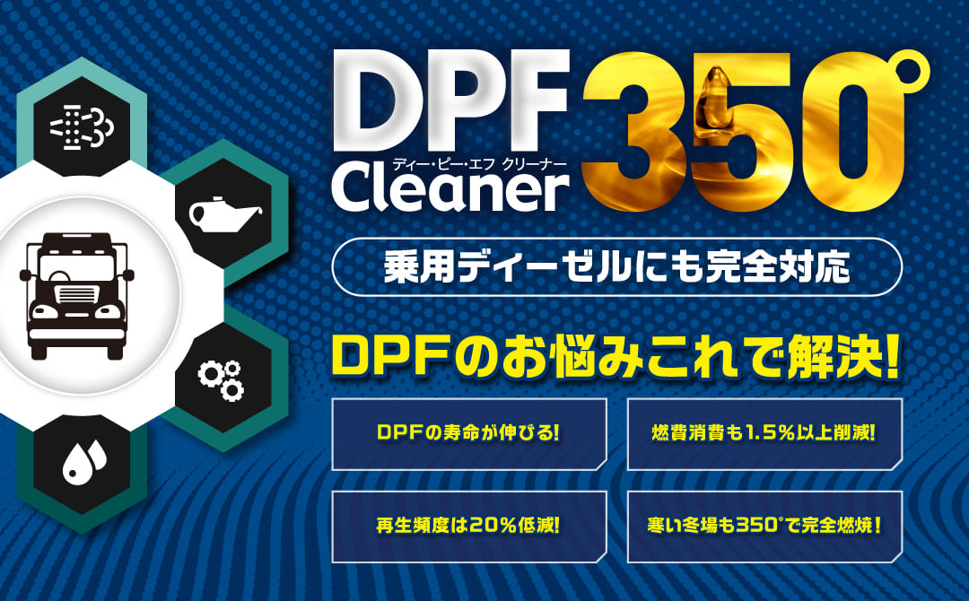 そもそも日本は渋滞が多く短距離走行になりがちであることから、効率的にPMを燃焼させることが難しく、DPFのトラブルが発生しやすいと言われています。正常に自動再生が完了せず、DPFに溜まるPMの量が制限を超えて、手動再生を促す警告メッセージが表示されやすいです。ディーゼル車と相性が悪いと言える日本の環境下でも問題なくトラックを走行させるためには、定期的にDPFのメンテナンスをすることが推奨されます。そのメンテナンスに一役買っている製品が、弊社のDPFクリーナー350°です。
